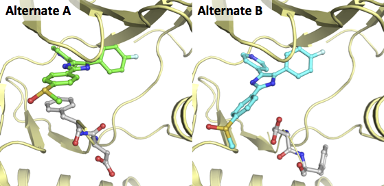 A great example of two alternates for a ligand and residues is the X-ray of MAP kinase p38 in complex with a pyridinylimidazole (PDB-code 2EWA). In the figure below this structure is depicted for both alternates in exactly the same orientation: