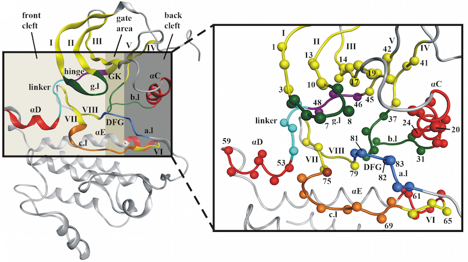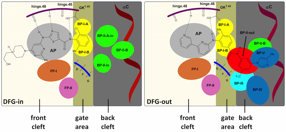 The binding site of the catalytic domain of kinases can be roughly divided into three main pockets: the front pocket, the gate area and the back pocket. Several kinases also have specific subpockets that have been classified into front pockets I and II, back pockets I-V. A schematic representation is given below (see our publication for more information):