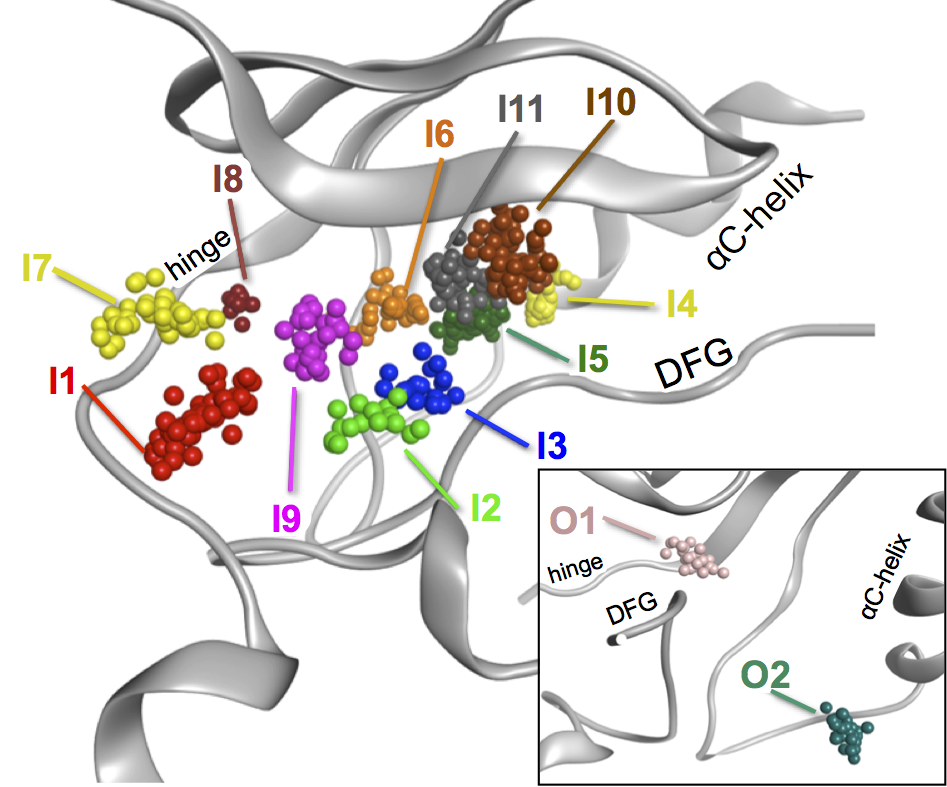 Based on the overlay of all kinase structure we have analyzed the presence of (highly) conserved waters that frequently interact with the co-crystallized ligand. This resulted in the identification of 13 positions in which water appear in kinase structures with a high frequency. These positions have been named I1-I11 and the DFG-out specific structures have been classified as O1 and O2.The position of these water clusters are highlighted in the figure below: